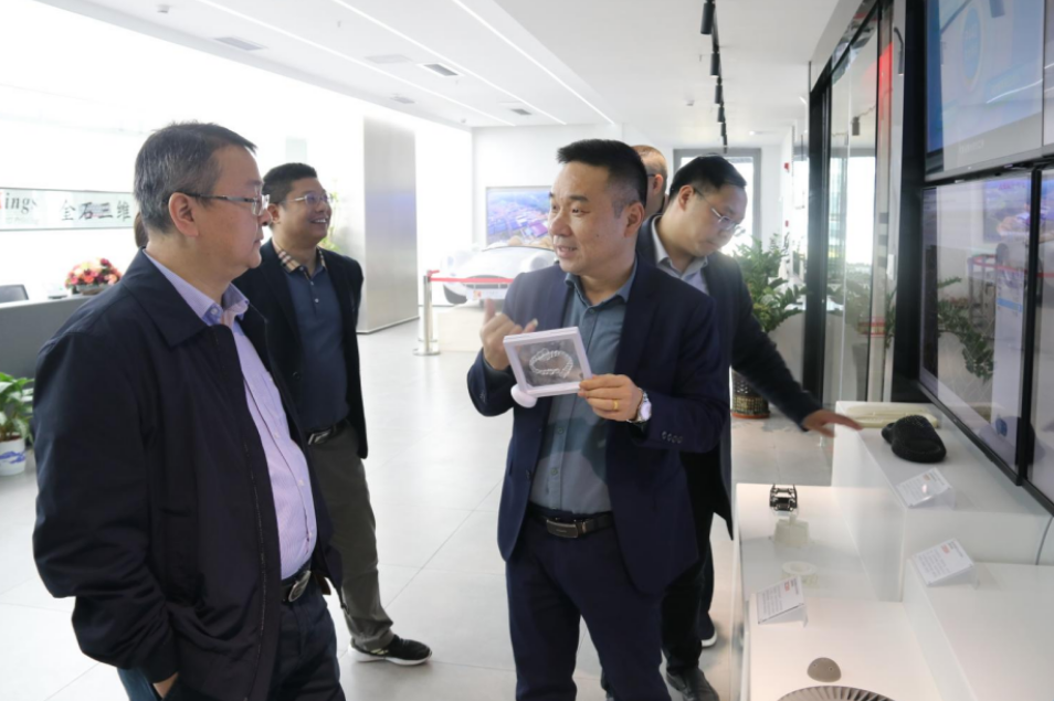 在金石三维3D打印主题展厅,总经理邱海平向李建春行长一行详细讲解了公司的发展历程、研发成果、产品优势、市场前景以及公司产品在航空、汽车、医疗、鞋业等领域的应用情况,同时介绍了金石三维在整个3D打印行业中的地位。