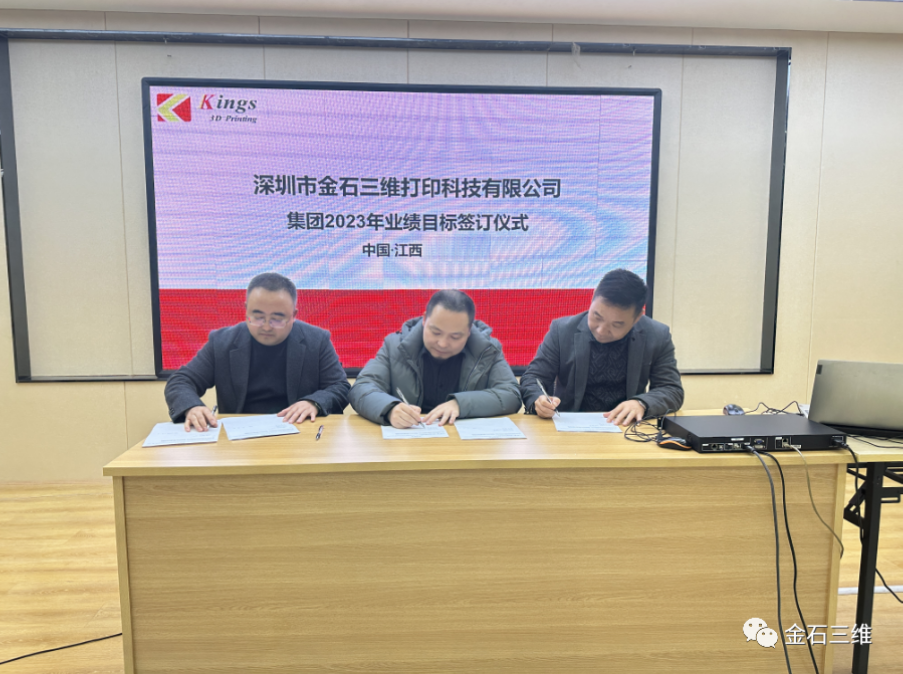 金石三维董事长江泽星、总经理邱海平、广州雷佳(金石集团子公司)董事长陈丙云携各子公司管理团队及业务部门核心骨干共同参与了此次会议。江总、邱总、陈总代表集团签订了2023年业绩目标计划书。